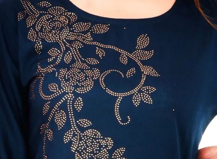 Stones are sewn onto the garment using a needle and thread. This method is often used for delicate fabrics like chiffon and silk.